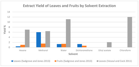 Extract yield of leaves and fruits of P. angustifolium by solvent extraction (chart plotted based on data from [10,15]).