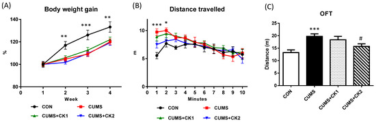 As shown in Figure 1A, the CON group constantly gained weight, and a significant difference was observed from that in the CUMS group at weeks 2 (** p < 0.01), 3 (*** p < 0.001), and 4 (** p < 0.01). However, no significant differences were noted among the CUMS, CUMS + CK1, and CUMS + CK2 groups.