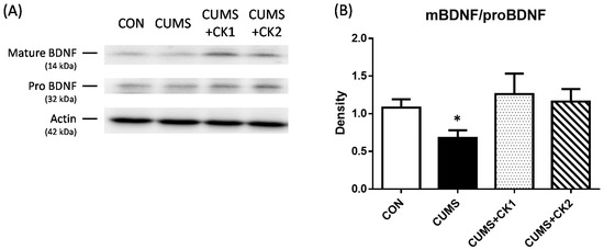 BDNF levels in hippocampal tissue were previously shown to decrease under CUMS [14]. Western blotting in the present study revealed that the ratio of mature BDNF (14 kDa) to proBDNF (32 kDa) was significantly lower in the CUMS group than in the CON group (* p < 0.05), whereas no significant differences were observed in the CUMS + CK1 and CK2 groups (Figure 2) at this time point. Mature BDNF is cleaved from proBDNF, and it binds to the tyrosine kinase B (TrkB) receptor.