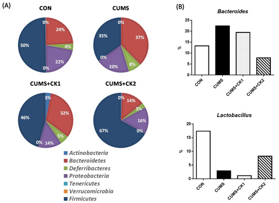 The gut microbiota modulates adult neurogenesis, and a Lactobacillus strain was found to promote the survival of hippocampal neuronal progenitors [15]. Furthermore, previous studies showed that the abundance of Bacteroidetes in the microbiota of depressed animals increased, whereas that of Lactobacillus decreased [16]. Regarding the results of next-generation sequencing of the gut microbiota in the cecum in the present study, a comparison of the relative abundance of different phyla in the gut microbiota showed marked decreases in the abundance of Firmicutes and increases in that of Bacteroidetes in the CUMS group; in contrast, the CK-treated groups showed increases in Firmicutes and decreases in Bacteroidetes (Figure 4A). The abundance of Bacteroides, classified in Bacteroidetes, increased in the CUMS group; however, this increment was suppressed in the CUMS + CK2 group. In contrast, the abundance of Lactobacillus, classified in Firmicutes, markedly decreased in the CUMS group, and this reduction was suppressed in the CUMS + CK2 group (Figure 4B).