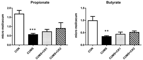In the analysis of SCFAs in the cecal contents by HPLC, propionate and butyrate concentrations were both significantly decreased in the CUMS group, whereas no significant differences were observed in the CUMS + CK groups for improvement (Figure 5).