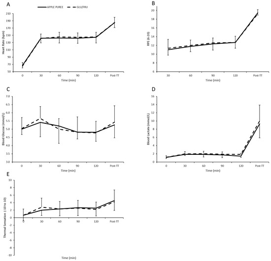 Laboratory conditions were not different between trials (GLU/FRU 21.8 ± 2.1 °C; APPLE PUREE 21.7 ± 1.7 °C; p = 0.556), relative humidity (GLU/FRU 35.4 ± 11.9%; APPLE PUREE 37.5± 14.4%; p = 0.272), or barometric pressure (GLU/FRU 751 ± 12 mmHg and APPLE PUREE 758 ± 8 mmHg; p = 0.128).