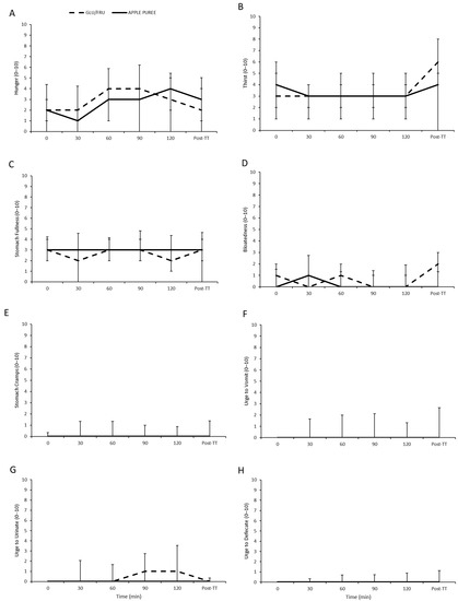 GI scales for all symptoms were not significantly different between trials (trial effect p ≥ 0.052 interaction effect p ≥ 0.085; Figure 2). On average, no symptoms were classed as severe (≥5 out of 10), although some individual participants did report symptoms ≥ 5, including hunger (GLU/FRU 4 participants; APPLE PUREE 4 participants), thirst (GLU/FRU 6 participants; APPLE PUREE 4 participants), stomach fullness (GLU/FRU 3 participants; APPLE PUREE 4 participants), stomach cramps (GLU/FRU 1 participant; APPLE PUREE 0 participants), bloatedness (GLU/FRU 0 participants; APPLE PUREE 1 participant), urge to vomit (GLU/FRU 1 participant; APPLE PUREE 3 participants), and urge to urinate (GLU/FRU 3 participants; APPLE PUREE 1 participants). Thirst also increased over time (p = 0.007).
