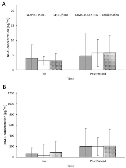 Sample Processing and Analysis. For each urine sample, the volume was determined and urine specific gravity was measured using a hand-held analyser (Ceti, Refractometer) before the sample was stored at −80 °C until analysis for biomarkers of kidney damage, KIM-1 (kidney injury molecule-1), and NGAL (neutrophil gelatinase-associated lipocalin), by enzyme-linked immunosorbent assay (ELISA) (Human, NGAL ELISA kit, Bioporto, Hellerup, Denmark; Human KIM-1, ELISA kit ADI-900-226-001, Enzo Life Sciences, Lausen, Switzerland) in the pre- and post-preload urine samples only. Samples from the familiarisation trial (maltodextrin only) were included in this analysis to provide a fructose-free comparison.