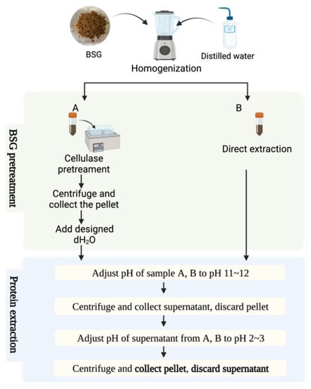 The BSGP samples were generated by alkaline extraction after cellulase pretreatment. Briefly, wet BSG was suspended in distilled H2O (d H2O) (1:4 v/w) and then the mixture was heated to 50 °C in a water bath. The pH was adjusted to 4.5. A ratio of 1:50 of cellulase was then added to the BSG solution and allowed to incubate for 60 min. HCl (1.00 M) or NaOH (1.00 M) was continuously added to the reaction system during the pretreatment to maintain the pH within the set value of pH 4.5 ± 0.1. After the 60 min had elapsed, the suspension was inactivated at 85 °C for 20 min and then centrifuged at 3800× g and 4 °C for 15 min (Hettich Rotanta 460RF centrifuge, Baden-Württemberg, Germany). The supernatant was discarded, and the resulting precipitation was stored at −20 °C for future protein extraction.