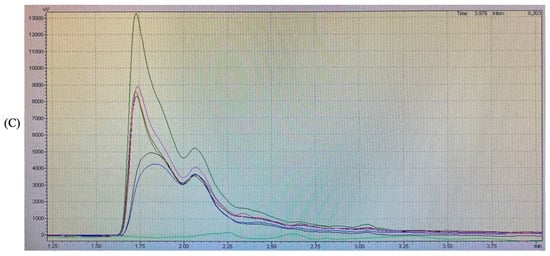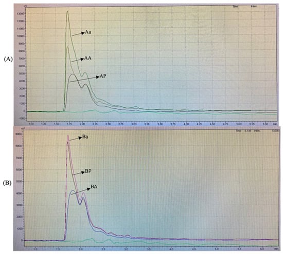 The RP-HPLC analysis was performed with a hydrophobic phase of 70% acetonitrile and a hydrophilic phase of ultra-pure water. The results obtained for each group are shown in Figure 2.
