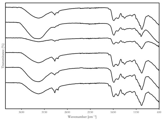 The infrared spectra of the samples were recorded between 4000 and 650 cm−1 at a resolution of 4 cm−1 using a Nicolet iS10 spectrometer (PerkinElmer Inc., Waltham, MA, USA) mounted with an attenuated total reflectance (ATR) accessory. The powder was directly placed on a single reflection diamond ATR accessory and pressed to have good contact between the crystal and sample. Spectra processing was performed using the software EZ Omnic (Thermo Electron Corporation, Madison, WI, USA).