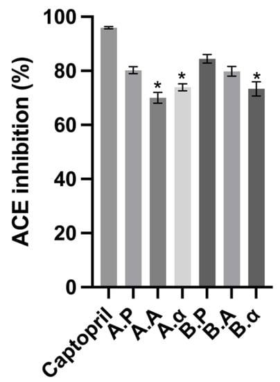 ACE inhibitory activity was tested using a colorimetric detection assay, as described by [23,24]. This detection system measures the amount of 3-hydroxybutyric acid (3HB) produced by ACE from 2-hydroxybutyryl-Gly-Gly-Gly. Experiments were carried out as independent six replicates assayed in triplicate. The ACE-inhibitory ratio was calculated using GraphPad Prism 9 from the sigmoidal dose-response versus the negative control. The values were expressed as the mean ACE inhibition percentage ± standard deviation (n = 3). CaptoprilTM was used as a positive control.