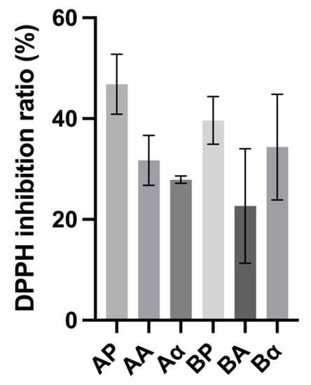The DPPH inhibitory activity of BSGP and its associated hydrolysates generated with Alcalase and α-chymotrypsin had inhibition values ranging from 22.66 ± 9.26% to 46.87% ± 4.87%. As shown in Figure 5, no significant differences (p > 0.05) were found between BSGP, and the hydrolysates generated using Alcalase and α-chymotrypsin. These activities were significantly higher than light malt extracts (Pilsen, melano, melano 80 and carared) (15 ± 1%) as reported by Moreira, Morais [47]. Generally, the intact BSGP displayed higher DPPH inhibition activity than hydrolysates generated with Alcalase and α-chymotrypsin, which is in accordance with the ACE inhibitory activity obtained. These results indicate that the intact BSGP have been hydrolyzed during the beer fermentation, leading to the release of potent DPPH inhibitory peptides.