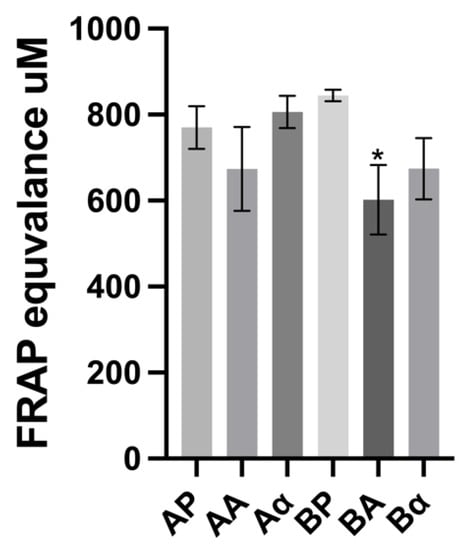The FRAP assay was also used for in vitro assessment of antioxidant properties; the relative ability of ferric reducing power has been compared with the ferrous standard. The results from this assay were similar to those obtained for the DPPH assay, with intact BSGP exhibiting a stronger ferric reducing antioxidant power (except for the α-chymotrypsin hydrolysates from enzyme-pretreated BSGP), as shown in Figure 5. The BSGP and its related hydrolysates displayed relatively high FRAP values. As can be observed in Figure 6, significant differences were observed for the Alcalase hydrolysate from directly alkaline extracted protein, where the FRAP value for BSGP hydrolysates (601.90 ± 65.82 μM) was significantly lower (p < 0.05) than the corresponding BSGP (844.63 ± 11.12 μM). The ferric-reducing activity found in BSGP and its hydrolysates was higher than rice bran protein hydrolysates (125.09 ± 1.45 µmoL Fe2+ equivalent/g sample) reported by Phongthai, D’Amico [48]. The α-chymotrypsin hydrolysates resulted in higher FRAP values than Alcalase hydrolysates in both groups of BSGP. The proteolytic preparation used for the generation of hydrolysates clearly had an impact on the antioxidant activity obtained. No previous research appears to have reported on the comparative antioxidant assays between cellulase-pretreated BSGP and its associated hydrolysates, or directly extracted BSGP and its related hydrolysates.