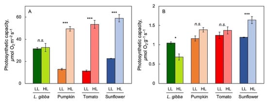 Light- and CO2-saturated photosynthetic capacity per area (A) as well as per biomass (B) for Lemna gibba (green), pumpkin (orange), tomato (red), and sunflower (blue) grown under low (dark-color columns) and high (light-color columns) PFD. Mean values ± standard errors; n = 3 for all species. Significant differences between PFD conditions are denoted by asterisks *** = p < 0.001; * = p < 0.05; n.s. = not significantly different. Based on recalculation of original data from [55,83].