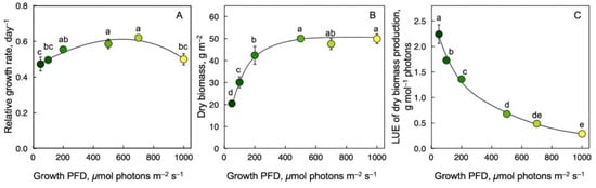Relative growth rate, RGR (A), ratio of dry biomass per frond area (B), and light-use efficiency (LUE) of dry biomass production (C) for Lemna gibba grown under a range of seven growth PFDs. Symbol colors from dark green to yellow correspond to frond color under the respective growth PFDs from 50 to 1000 μmol photons m–2 s–1 (see Figure 1). Mean values ± standard deviations; n = 3 for all growth PFDs except for the lowest growth PFD (50 μmol photons m–2 s–1; n = 7). Different lower-case letters represent significant differences at p < 0.05. Data on RGR from [55,59].