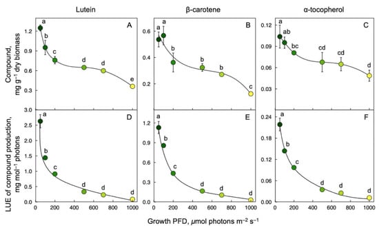 Production of lutein (A), β-carotene (B), and α-tocopherol (C) per dry biomass, and light-use efficiency (LUE) of lutein (D), β-carotene (E), and α-tocopherol (F) production for fronds grown under a range of growth PFDs. Shades from green to yellow correspond to the respective growth PFDs (see Figure 1). Mean values ± standard deviations, n = 3 for all growth PFDs except for the lowest (50 μmol photons m–2 s–1; n = 3, 4, or 7). Different lower-case letters represent significant differences at p < 0.05. Based on recalculation of original data from [55,59].