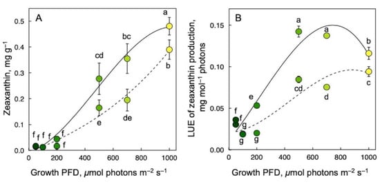 Zeaxanthin production per dry biomass (A) as well as light-use efficiency of zeaxanthin production (B) immediately upon removal from growth conditions (without recovery; solid lines) or with a 30 min recovery period in low light (dashed lines). Symbol shades from green to yellow correspond to frond color under the respective growth PFDs (see Figure 1). Mean values ± standard deviations, n = 3 for all growth PFDs except for the lowest growth PFD (n = 4 or 7 for 50 μmol photons m–2 s–1). Different lower-case letters represent significant differences at p < 0.05. Based on recalculation of original data for zeaxanthin content at harvest from [55,59] with additional data for zeaxanthin content 30 min post-harvest.
