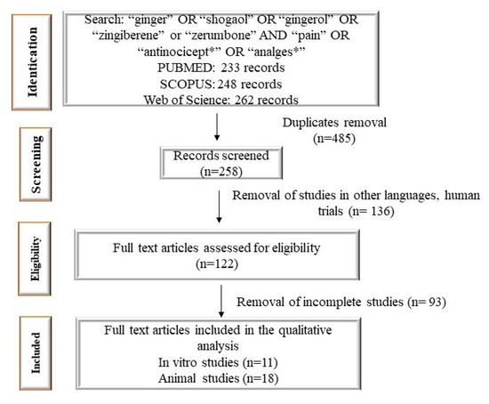 This narrative review was written after extensive research of PubMed, SCOPUS, and Web of Science. We used the following keywords: “ginger” OR “shogaol” or “gingerol” OR “zingiberene” OR “zerumbone” AND “pain” OR “antinocicept*” OR “analges*”. The research followed Egger’s criteria [47], was time-limited (from 2010 to 2022), and restricted to English and in vitro studies or animal experiments investigating the analgesic effect of the ginger extract or its components. The analysis was carried out in the form of a narrative review (Figure 2). The following data were extracted: (a) for in vitro studies: utilized cell line, challenge, form and dosage of ginger, and study findings; (b) for in vivo studies: utilized animals, experimental model, form and dosage of ginger, and the results and associated molecular mechanisms. The animal studies not reporting any data on molecular mechanisms were excluded.
