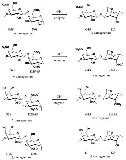 Carrageenans are phycocolloids present in macroalgae, which are aquatic photosynthetic organisms with a high percentage of vitamins, minerals, dietary fiber, and traces of lipids []. These are a health benefit as they are rich in essential omegas and polyunsaturated fatty acids [,,]. Carrageenans are a component of the cell wall and intercellular spaces of several species of red algae, being extracted especially from Chondrus crispus [,]. One of the first references to the use of carrageenan occurred in Carragheen, in the South of Ireland, where Chondrus crispus extracts were used in the confection of home cough and cold treatments []. Classified as linear sulfated polysaccharides, chemically, the carrageenans consist of repeated units of disaccharides [,]. The various types existing in nature (xi—ξ, theta—θ, beta—β, mu—μ, and nu—ν) make most chains hybrid rather than simple. In industry, three types are usually extracted, the kappa (κ)-, the iota (ι)- and the lambda (λ)-carrageenans [,,]. The alkaline method is the most common extraction process and, in this case, the precursors μ- and ν-carrageenan lead to the formation of the types κ- and ι-carrageenan, respectively (Figure 1) [].
