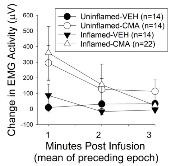 3.4. Experiment 2C: Effect of Inflammation and Intravesical CMA on Cystometrograms