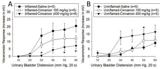 3.5. Experiment 3: Effect of Cinnamon on Visceromotor Responses to Graded Urinary Bladder Distension