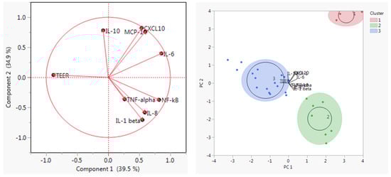 A principal cluster analysis and K means clustering revealed three distinct clusters (Figure 1): one for soybean meal, one for bacterial meals, and one for the remaining protein sources. The eigenvalue for component 1 was 3.56 and for component 2 was 3.14. The bacterial meal cluster was associated with higher levels of pro-inflammatory cytokines and the lowest TEER values. Soybean meal exhibited both pro- and anti-inflammatory features. The remaining products within cluster 3 had generally neutral or anti-inflammatory properties and higher TEER values, and yeasts were more prominently anti-inflammatory.