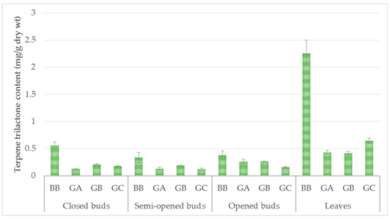 According to the literature, the terpene trilactone content of ginkgo leaves varies between 1.45 and 2.85 mg/g dry wt [22]. Our results showed higher values (3.75 mg/g dry wt) than those previously reported. Bilobalide was the most important metabolite among the terpene trilactones at all four developmental stages. This compound was present at a concentration of 0.56 ± 0.06 mg/g dry wt in the closed buds, and reached 2.26 ± 0.24 mg/g dry wt in the summer leaves. This finding agreed with previous research published on ginkgo leaves. Two studies have previously investigated the seasonal dynamics of bilobalide and ginkgolide accumulation in ginkgo leaves [22,23], but they did not take into account the bud development stage.