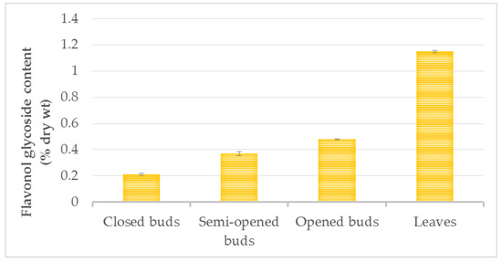 The amount of total flavonoids increased from the closed-bud stage (0.21 ± 0.01% dry wt) and the semi-open bud stage (0.37 ± 0.03% dry wt) to the opened-bud stage (0.48 ± 0.03% dry wt), with the greatest difference observed between the closed buds and the opened buds (Figure 5). The flavonol variations may be explained by the presence of scales that fully enclosed the closed buds, whereas the scales remained only at the base of the developed buds.