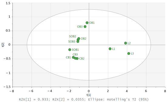 PCA score plot of the G. biloba samples; L1–3 = leaves, OB1–3 = open buds, SOB1–3 = semi-open buds, CB1–3 = closed buds.