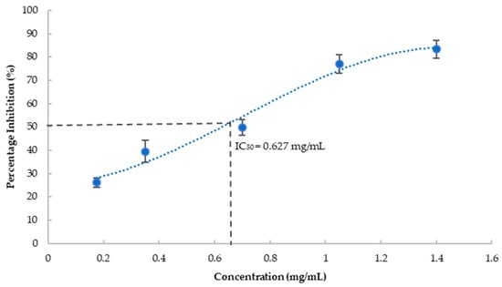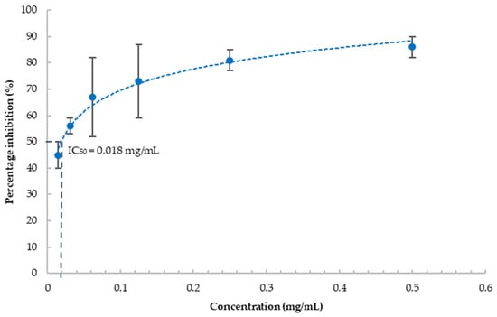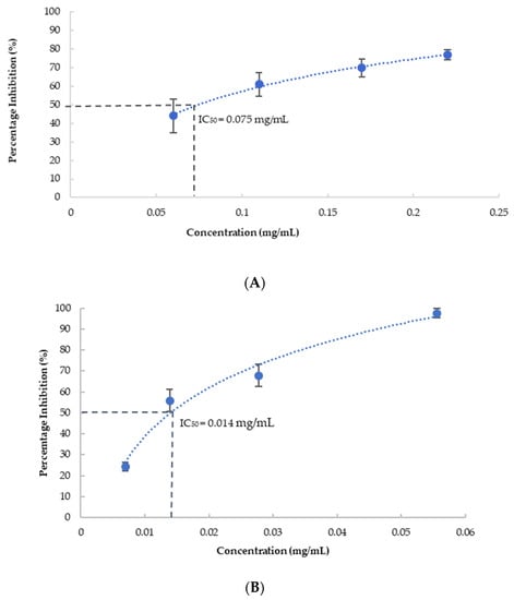 where E is the activity of the enzyme without the inhibitor (negative control) and S is the activity of the enzyme with the inhibitor. IC50 of enzymatic inhibition was defined as absolute inhibition of 50% of the enzymatic activity of respective enzymes, using the non-linear regression of the dose–response curve [].