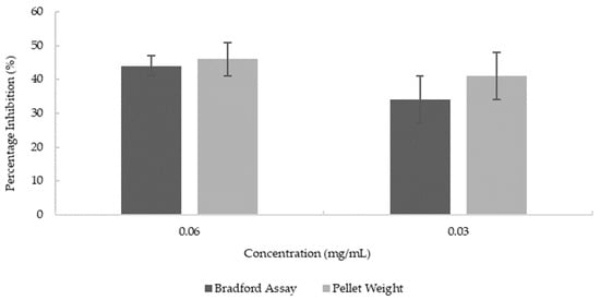 Reduction in the synthesis of AChE at various concentrations of blueberry extract. Values are presented as the mean ± SD; n = 4 for the pellet weight method and n = 6 for the Bradford assay.