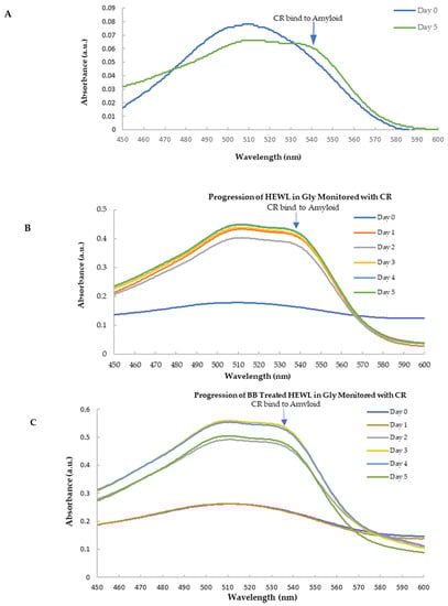 Spectra of CR with HEWL and blueberry-treated HEWL. (A) The spectra of CR with HEWL (normalized against day 0). The amyloid fibril induced a 536 nm peak in the day 5′s sample. (B) The spectra of CR with HEWL alone during 5 days; (C) The spectra of CR with blueberry-treated HEW during 5 days.