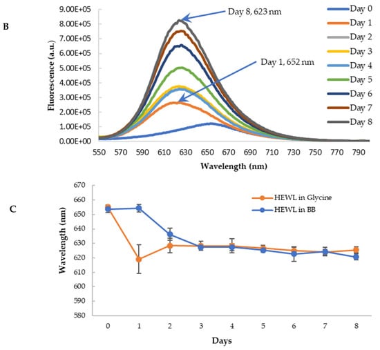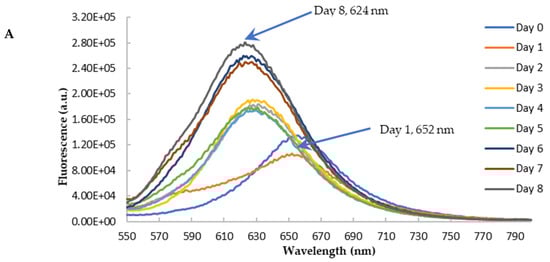 To further confirm the findings from CR binding, we used Nile red (NR) to probe the effects of blueberry on the amyloid genesis and surface hydrophobicity of HEWL. NR is a hydrophobic dye whose fluorescence emission wavelength and intensity vary depending on the polarity of the environment [,]. Its fluorescence is quenched in an aqueous solution. In the hydrophobic environment, the wavelength of the NR fluorescence moves to a shorter wavelength (blue shift) with the increase of the fluorescence intensity []. NR’s fluorescence is independent of pH. During the amyloid aggregation, the overall structure of protein changes, and the hydrophobic regions are exposed. Therefore, NR becomes a versatile extrinsic probe for amyloid detection. The longer emission wavelength of NR (above 600 nm) can also reduce the interferences of polyphenols and other small molecules, making it possible to use NR screening anti-fibril drugs against amyloid diseases []. The aged HEWL sample at high temperature and low pH showed an increase in the fluorescence of NR with the blueshift of the maximum emission wavelength (from 652 nm to 625 nm) as depicted in Figure 9A. This observation is in agreement with the observations from the CR binding assay, confirming the formation of amyloid aggregation in aged samples. Similar to the findings from CR, the treatment of blueberry prevents amyloid fibril formation in the first 24 h and the blue shift of emission wavelength starts on day 2 (Figure 9B,C).