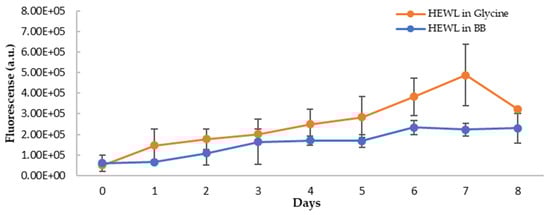The visual inspection of the aged HEWL treatment samples showed more turbidity than the fresh HEWL, suggesting a correlation between the turbidity and amounts of aggregates in the samples. The turbidity of HEWL alone is more than the blueberry-treated sample by visual examination. To quantify the turbidity, we monitored the light scattering using the fluorometer by using the same wavelength (800 nm) for excitation and emission. The reading at a 90-degree angle from the light source in the fluorometer removes the interferences from the sample absorbance. The long wavelength (800 nm, near IR range) was chosen to further reduce any sample absorbance interferences. The respective blanks were subtracted from samples to correct any background interference. As shown in Figure 11, the turbidity of both samples increases over the eight-day period, however, the HEWL in glycine has a higher degree of turbidity. On day 7 and day 8, the turbidity of the blueberries-treated sample is only about 63% and 60% of HEWL controls, respectively, suggesting a 37–40% decrease in amyloid aggregation. This trend is the same as in NR binding assay, suggesting that blueberries not only delay the amyloid fibril formation by 24 h but also slow down the progression of amyloid fibrils during the aging process. The decrease in light scattering on day 8 is possibly due to the settlement of the aggregation during the assay.