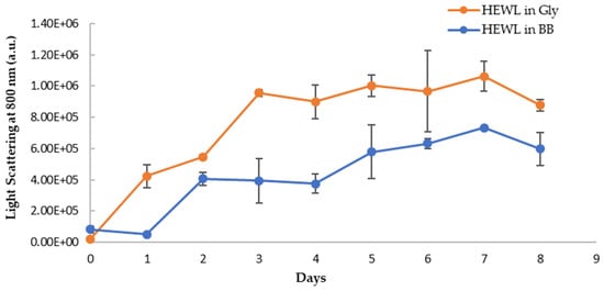 Hen egg white lysozyme (HEWL) aggregation was induced using an acidic pH environment and agitation under elevated temperature []. Lysozyme solution at 1 mg/mL (70 µM) was prepared in a 50 mM glycine buffer (pH 2.0) and agitation was induced by stirring using a magnetic stir bar spun at 170 rpm at 70 °C for eight days. The aggregation was monitored both by a visual examination as well as the absorbance measurement.