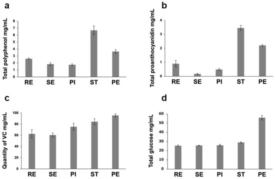 The extracts were quantified in terms of total polyphenol (Figure 2a), total proanthocyanidin (Figure 2b), total vitamin C (Figure 2c), and total glucose (Figure 2d) contents. The total polyphenol and proanthocyanidin contents of RE, SE, and PI were relatively low, while those of ST and PE were rather high. The vitamin C contents of RE and SE were lower than those of PI, ST, and PE, and the maximal value was observed for PE. Given that plants contain many glycosylated compounds and that many polyphenolics are glycated [37], we believe that total glucose content is an indicator of not only the amount of free glucose but also the amount of glycated compounds. Supplemental data are shown as the result of statistically evaluating whether the difference with other fractions in Figure 2 is superior compared to PE (Supplementary Materials Table S1).
