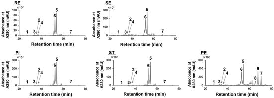Figure 3 shows the results of HPLC analysis for all extracts. The observed peak intensities suggest that the polyphenol contents of SE, PI, and ST exceed that of RE by a factor of three and are lower than that of PE by a factor of two. Detection was performed at a wavelength of 280 nm to secure the sensitive detection of flavan-3-ol derivatives and proanthocyanidins. The chromatograms obtained for RE, SE, PI, and ST were similar, showing only slight differences in individual peak intensities. In contrast, the PE chromatogram featured peaks not observed in other cases. Compounds 1 to 4 were identified as flavan-3-ol derivatives, namely (+)-catechin, (−)-epicatechin, procyanidin B4, and procyanidin C3, respectively, while compounds 5 and 6 were identified as ellagitannin derivatives, namely sanguiin H-6 and lambertianin C, respectively (Figure 4). These six compounds have been previously detected in raspberry leaves [21] and fruits [22] and have also been reported in the analytical studies of other research groups [20].