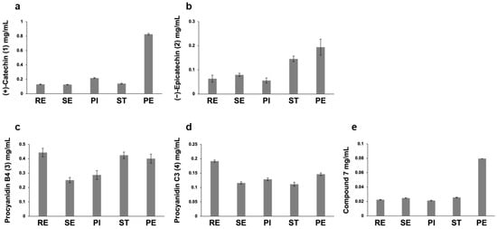 Contents of flavan-3-ol derivatives in crude extracts calculated from HPLC peak areas: (a) (+)-catechin (1); (b) (−)-epicatechin (2); (c) procyanidin B4 (3); (d) procyanidin C3 (4); (e) (−)-epicatechin-3,5-di-O-gallate (7). Compounds 1 and 2 were quantified with the help of a calibration curve prepared using commercially available compounds. Compounds 3, 4, and 7 have been calibrated using pure compounds prepared in our previous synthetic studies.