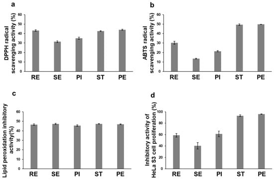Next, the biological activity of the extracts was evaluated. Given that the scavenging of reactive oxygen species and antioxidant activity are the main biological activities of polyphenolics, two radical scavenging activity tests, DPPH (Figure 6a) and ABTS (Figure 6b), and an antioxidant activity test using the TBA method were performed (Figure 6c). Both DPPH and ABTS radical scavenging activities were low for SE and PI and high for ST and PE. Regarding the radical scavenging activity of RE, DPPH showed a high scavenging rate, while ABTS showed a low scavenging rate. This suggests that RE contains compounds with different properties that affect DPPH and ABTS. All extracts showed similar moderate antioxidant activities. Radical scavenging activity was suggested to be correlated with the content of polyphenolic compounds. The inhibitory activity against HeLa S3 (Figure 6d) showed the same trend as radical scavenging activity (Figure 6a,b) and was highest for ST and PE. These results suggest that radical scavenging activity is correlated with polyphenol content. Supplemental data are shown as the result of statistically evaluating whether the difference with other fractions in Figure 6 is superior compared to PE (Supplementary Materials Table S3).
