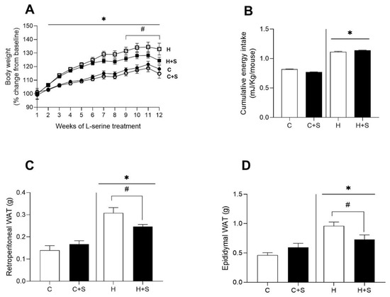 3.1. Effects of L-Serine Supplementation on Body Weight, Energy Intake, and Adiposity