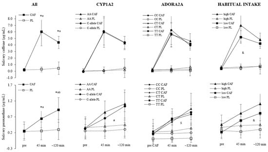 Salivary CAF and paraxanthine concentrations. CAF, caffeine; PL, placebo. * CAF significantly different from PL, # significant treatment × time × CYP1A2 interaction $ significant treatment × time × ADORA2A interaction, & significant treatment × time × habituation interaction, a significantly different than pre-ingestion, b significantly different than 45 min post-ingestion.