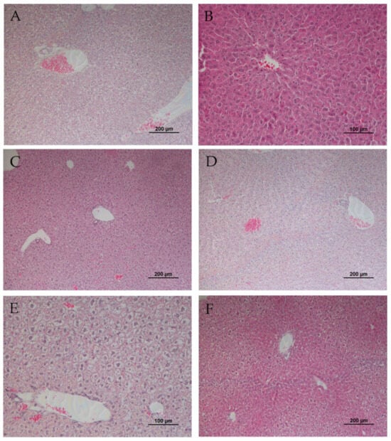 Liver sections from the animals under study (H&E): image (A) displays hydropic change with marked cellular swelling visible in an animal of group CTR (0 h); (B) normal hepatocytes from an animal of group 1 h post-ingestion of 790 mg/kg broccoli leaf flour (BLF); (C) normal liver architecture and hepatocytes from an animal of group 4 h post-ingestion of BLF; (D,E) hydropic change and cellular swelling in animals from group 12 h post-ingestion of BLF; and (F) mild hydropic change, mainly observed on liver zone 2 in an animal from group 24 h post-ingestion of BLF.