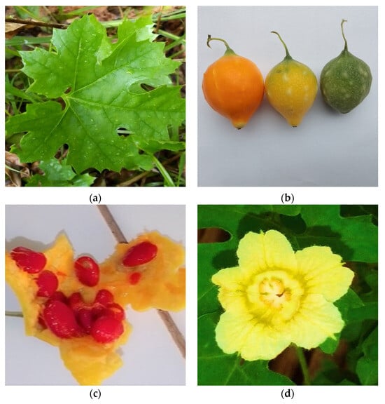 Different parts of the M. balsamina plant: (a) leaves, (b) fruits, (c) seeds, and (d) flower (Mareme THIAW, Ngoundiane (Thies-Senegal) 2022).