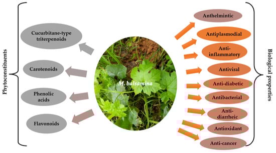 Based on findings from ethnopharmacology surveys, phytochemical screenings, and extract fractionation via chromatography, a range of biological tests can be conducted. These include assessments in vitro and in vivo of antioxidant, antibacterial, anti-diabetic, anti-inflammatory, anti-malarial, antiviral, and anti-HIV properties, among others (Table 1) [15,16,17,18]. The observed biological activities can be attributed to the presence of identified or isolated metabolites within M. balsamina extracts, including flavonoids, terpenes, phenolic acids, carotenoids, and more (refer to Table 1).