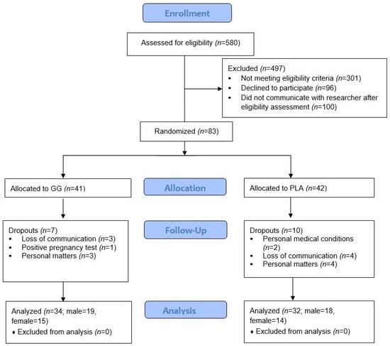 28]. The resulting total sample size estimation was 66. To account for potential dropouts, a buffer of +20% was applied to the total sample size estimate. A total of 83 participants were randomly assigned to the two possible study conditions. Following dropouts, a total of 66 participants (GG = 34, PLA = 32) completed the trial and were used for study analysis (