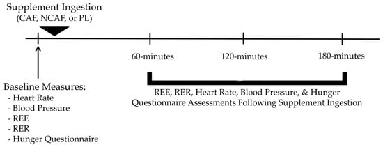 Figure 1 presents the sequence of events during each testing session. REE was assessed at baseline, 60-, 120-, and 180-min post-ingestion. After the baseline assessment, participants ingested 3 capsules of either CAF, NCAF, or PL, with water under the supervision of research personnel. All capsules were identical in shape, smell, size, color, and taste. Immediately after each REE assessment, the participants had their resting HR and BP assessed along with a hunger VAS scale. The hunger VAS scale was presented in Likert-style, with 7 possible responses on a continuous line ranging from “very hungry” to “full”.