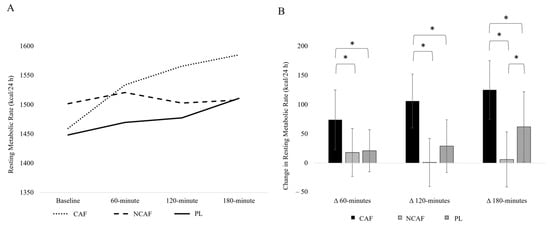 (A) REE values over the 180-min study period; (B) change from baseline in Resting Energy Expenditure; error bars represent 95% confidence intervals; * indicates statistical significance at the p ≤ 0.05 level.