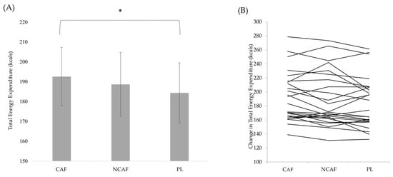 (A) Total energy expenditure over the 180-min study period; (B) individual responses for changes in total energy expenditure, with each line indicating one individuals REE values across each of the trials; * indicates statistical significance at the p ≤ 0.05 level.