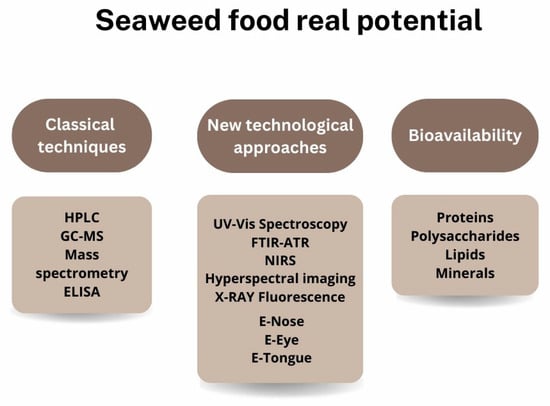 There is a requirement in the food sector to ensure product safety and quality; however, seaweeds live in areas where it is more difficult to ensure their safety and quality using just typical procedures for plants and vegetables [4]. As a result, the safety of seaweeds’ consumption and understanding of their quality is currently a hot topic in order to ensure a “new” food source that can substitute the plants’ part in the human diet, thereby reducing the pressure on the terrestrial ecosystem [10,107]. Still, the seaweed safety check is similar to terrestrial vegetables, being only necessary for the nutritional composition and bacterial analysis (Figure 6).