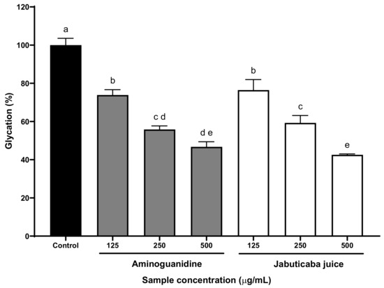 Antiglycation effect of Jabuticaba juice on human serum albumin–glucose glycation model (mean ± SD, n = 3; the letters represent the results of a one-way ANOVA with Tukey post-hoc multiple comparisons).