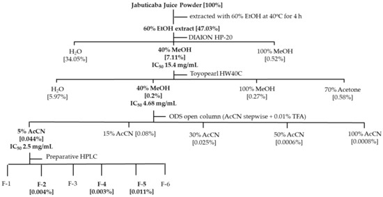 Flow chart of the extraction, fractionation, and purification of antiglycation active compounds from Jabuticaba juice. The active fractions are shown as bold. The percentages in parentheses denote the yields.