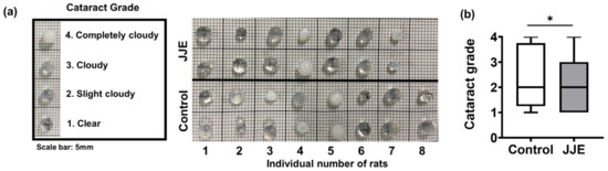 Evaluation of cataract grade between diabetic control and Jabuticaba juice extract (JJE) groups. (a) Rat lenses were removed from the eyes, and the degree of light backscattering was assessed by placing the lenses on a grid sheet. (b) The cataract prevalence based on grade was compared in each group (* p < 0.05, Wilcoxon sum-rank analysis).