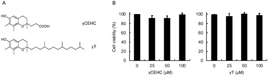 Chemical structures of γCEHC and γT (A) and their cytotoxicity on mouse hepatoma Hepa1c1c7 cells (B). The cells were pretreated with γCEHC or γT for 24 h, then incubated with an MTT solution (0.5 mg/mL) for 2 h. The cell viability values were expressed as the percentages of the corresponding control. Values are the means ± S.D. (n = 3).